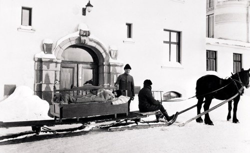 Bild från entrén till Umeå lasarett omkring 1920. Den tidens sjuktransporter, liksom transporter över huvud taget, skedde nästan enbart med fordon dragna av häst. Vintertid var det svårt att hålla kroppsvärmen vilket bilden ger uttryck för. Sannolikt användes varmvattenflaskor och liknande för att fördröja nedkylning, men säkert var