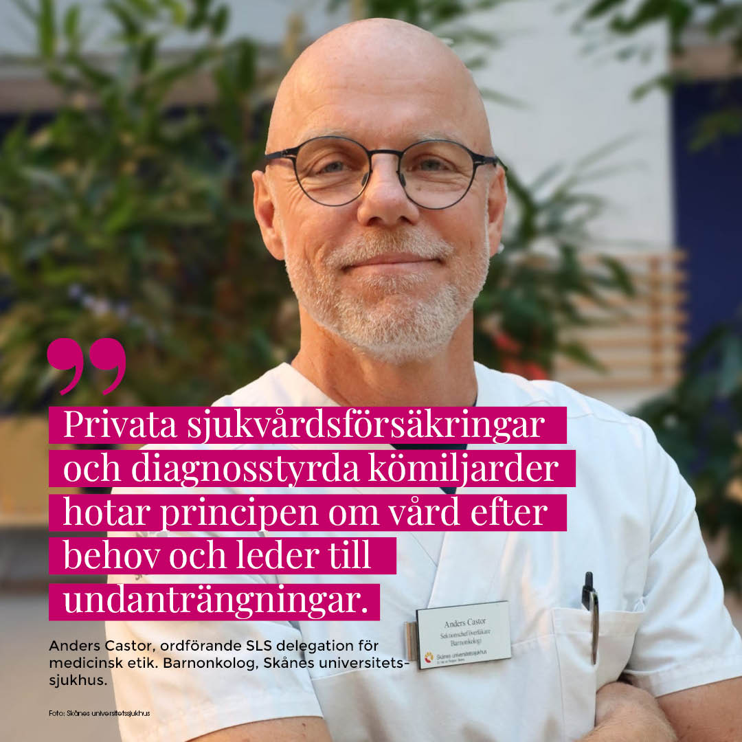 Även den växande användningen av privata sjukvårdsförsäkringar utmanar principen om vård efter behov. SLS ser med oro på att patienter med mindre medicinska behov kan få förtur till vård, vilket riskerar att urholka tilliten till ett solidariskt och behovsstyrt sjukvårdssystem.